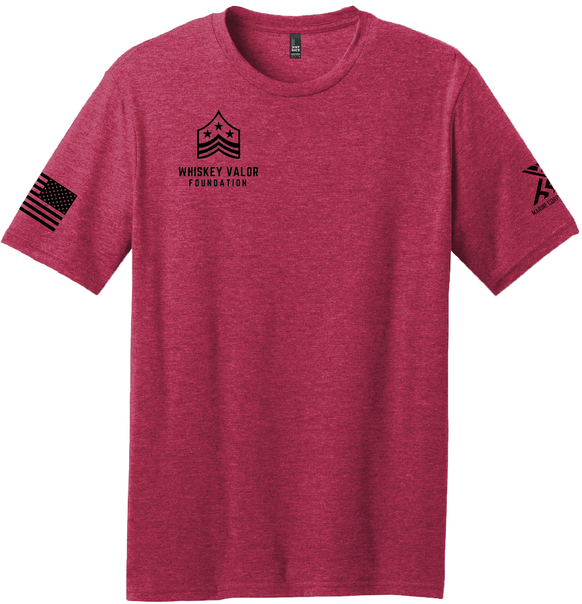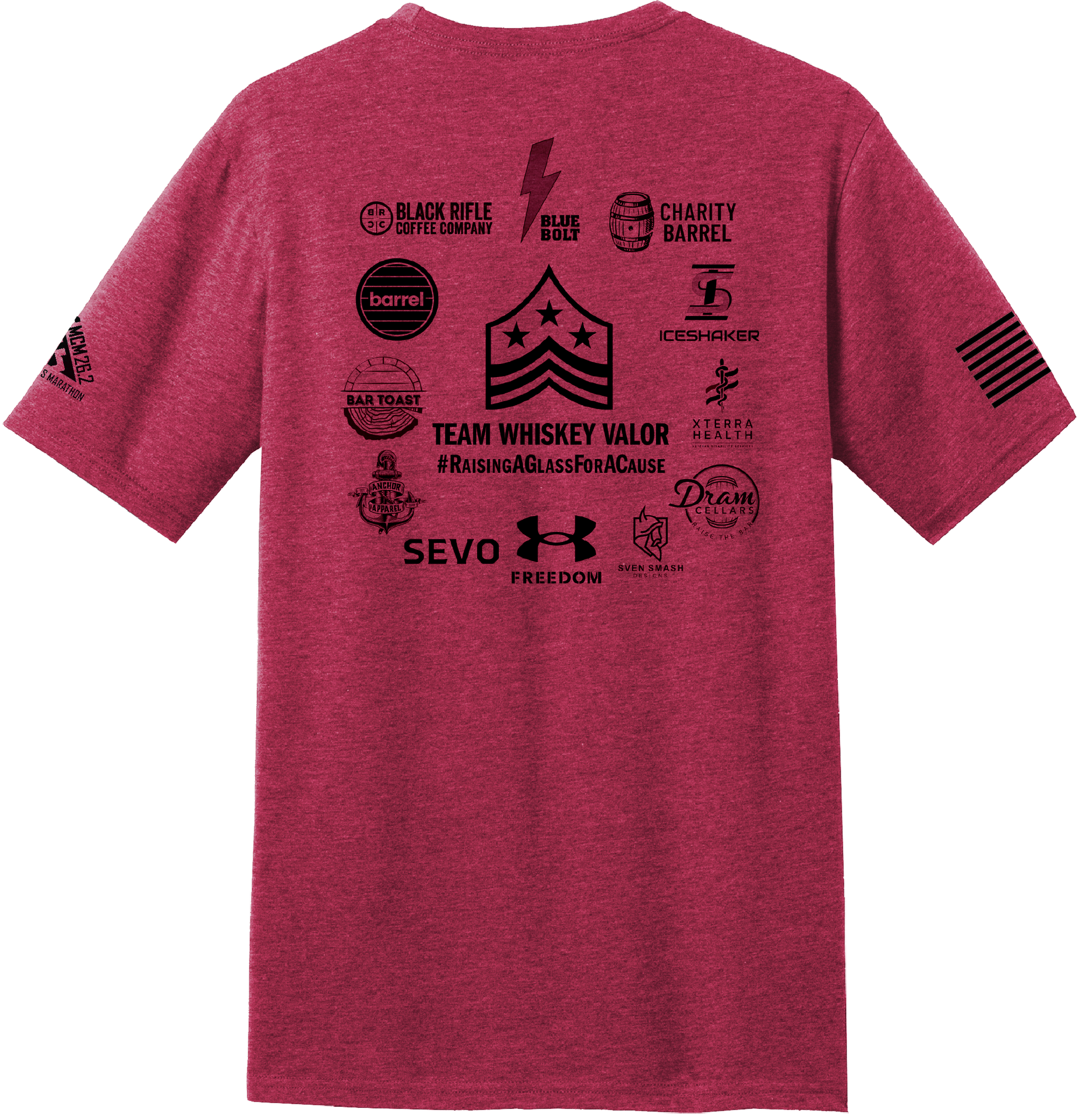 The t-shirt features Whiskey Valor's logo on the front right chest, American flag on the right sleeve, and all 12-partner logos surrounding our Team Whiskey Valor logo with #RaisingAGlassForACause.