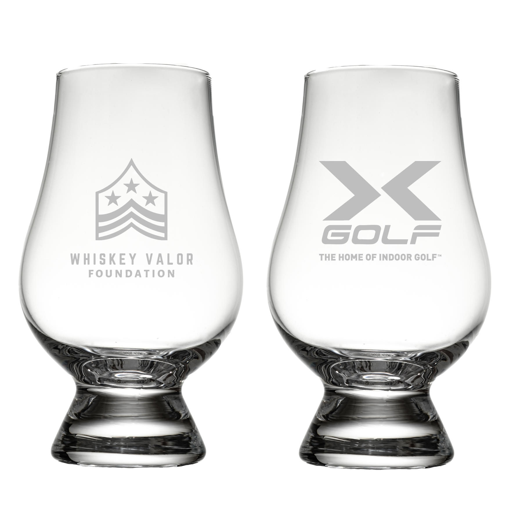 The X Golf x Whiskey Valor Foundation (WVF) double sided Glencairn Whisky Glass is the iconic glass designed by Glencairn in Scotland. Its bulbous shape enhances the appreciation of whiskey's rich color, while the tapered mouth provides an optimal aroma experience. Featuring our custom engraved logo, this glass allows you to savor your dram while supporting veterans and their families, with proceeds from each purchase contributing to this important cause.